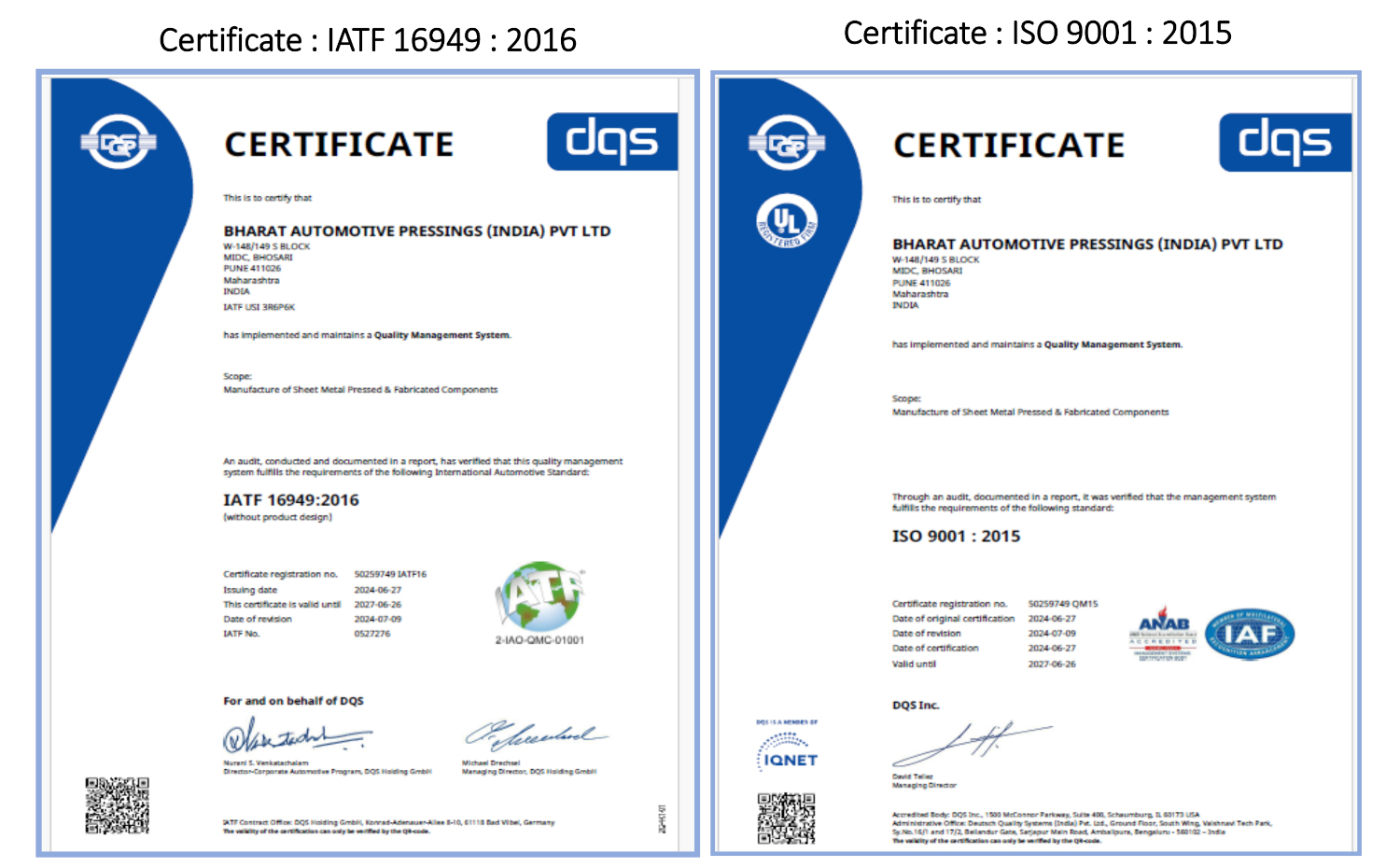 Bharat Automotive Pressings India Private Limited (BAPIPL) is an IATF 16949:2016 and ISO 9001:2015 certified automotive component manufacturing company, located at W-149, ‘S’ Block, MIDC, Bhosari, Pune – 411026, India.